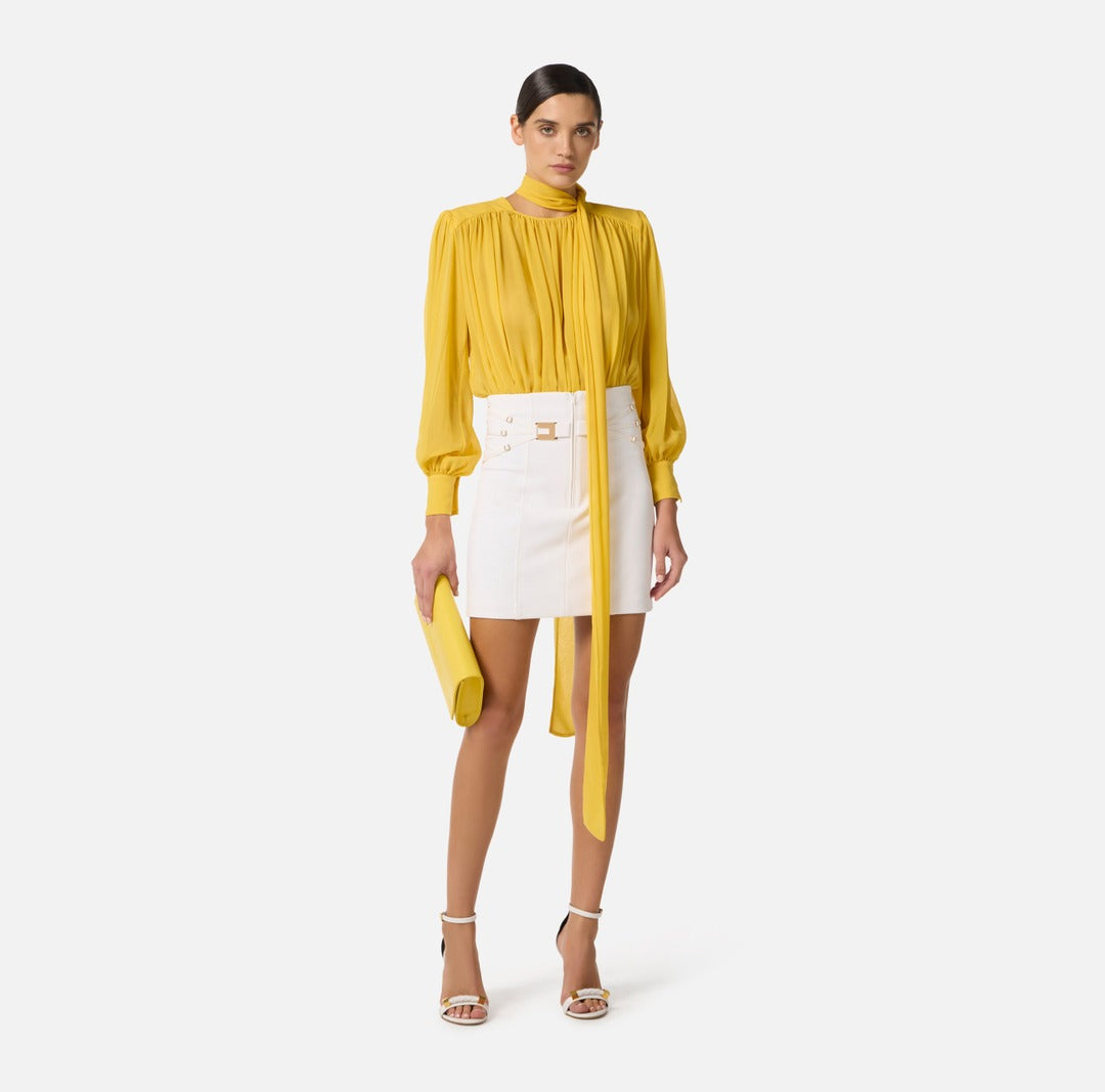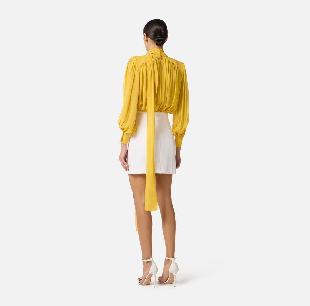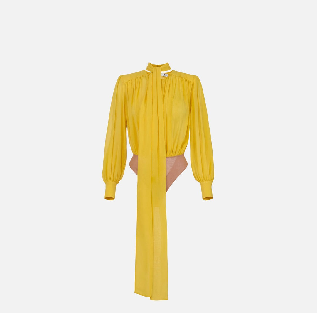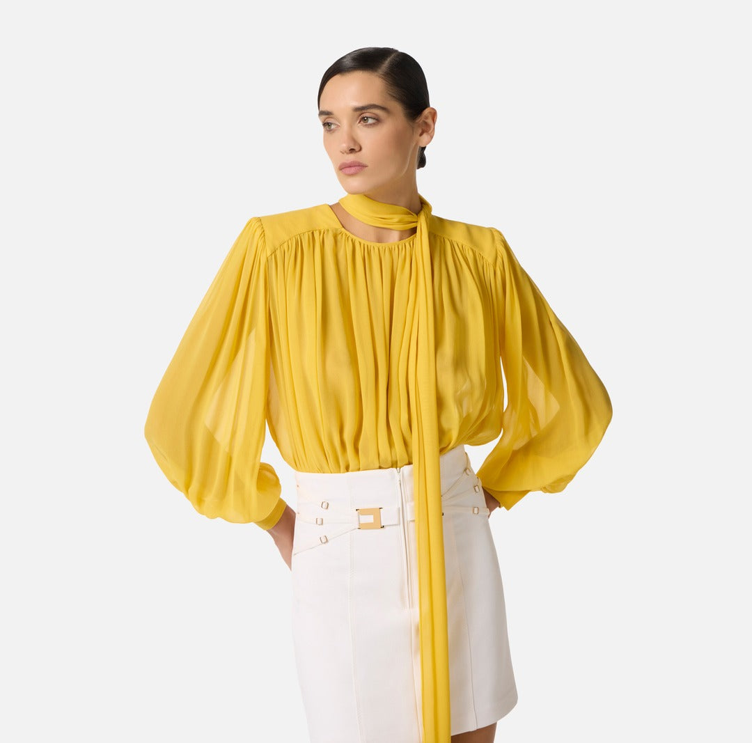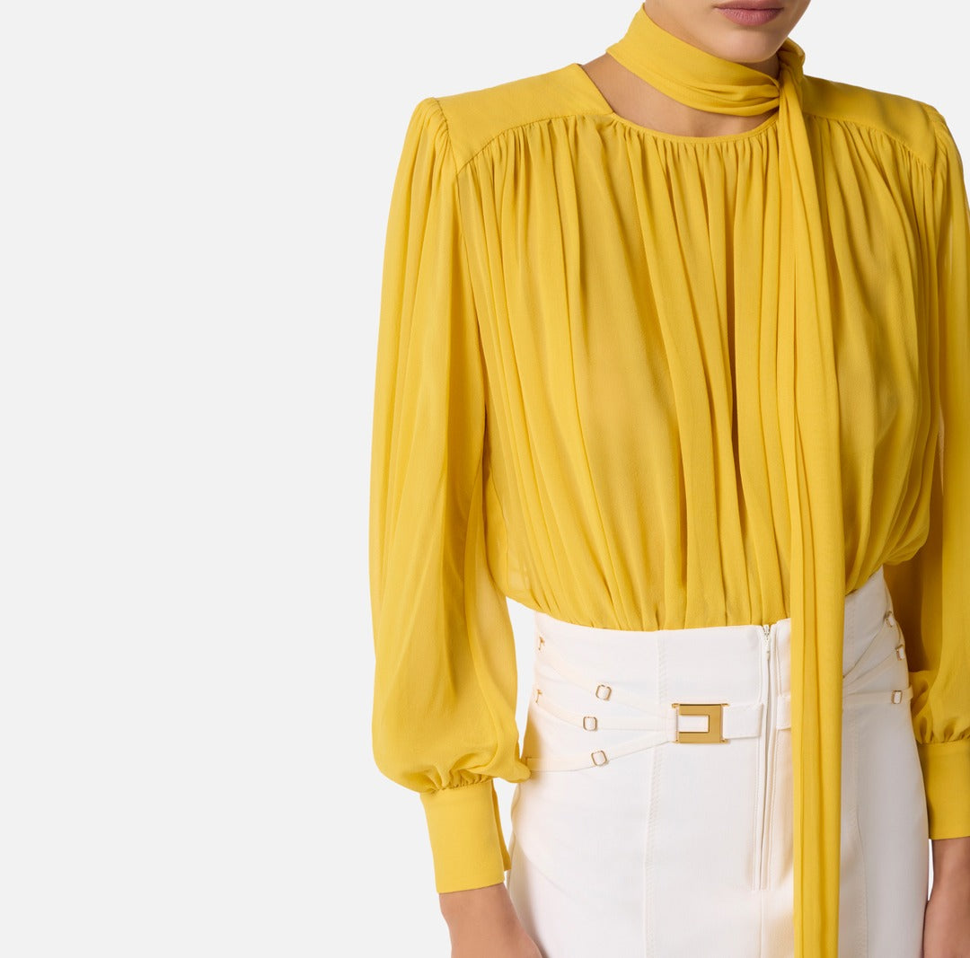 Body elegante Elisabetta Franchi in georgette di seta con spalle strutturate e maniche lunghe dai volumi balloon con polsi alti. A donare movimento, le arricciature e la lunga fusciacca da annodare al collo. Vestibilità regular.