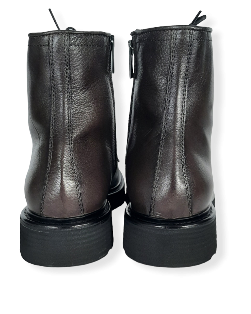 Anfibio con semplice allacciatura a derby a 8 fori e con ghette appena sopra la caviglia. Questo stivaletto è realizzato in bufalo pieno fiore color tra grigio e testa di moro conciato al vegetale (approfondisci). La particolare fibra di questo pellame conferisce al prodotto un look decisamente aggressivo e grintoso.