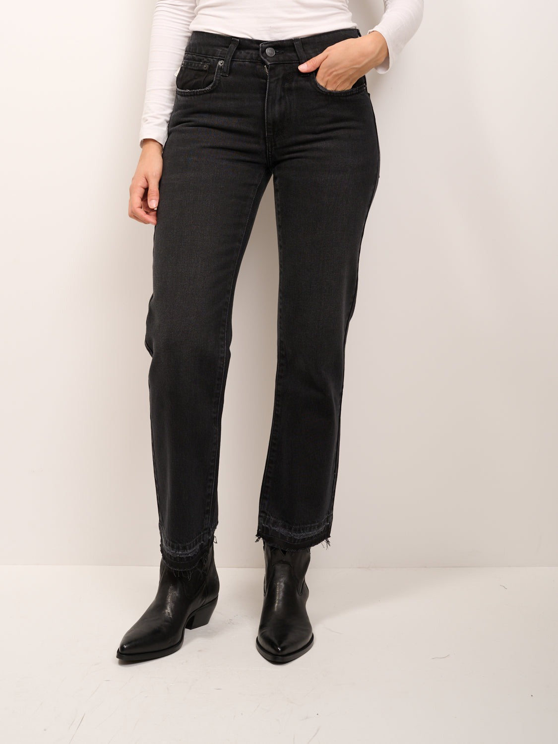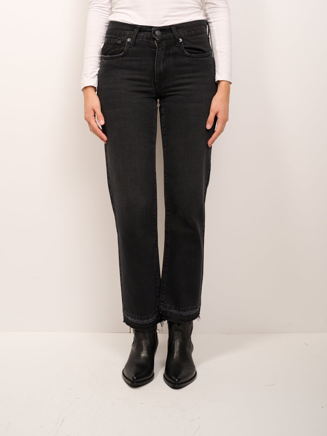 Jeans Zeke color nero Vicolo. Modello relaxed fit a vita media. Dettaglio di taglio vivo sul fondo. Chiusura bottone e zip.